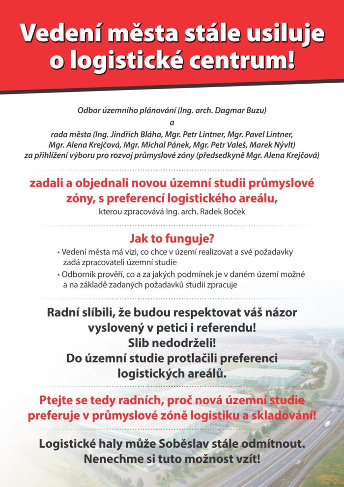 Jsme velmi znepokojeni obsahem připravované nové územní studie. Logistiku a skladování realizované velkými korporacemi nepovažujeme za strategicky vhodné využití území, které jsme si v Soběslavi určili jako průmyslovou zónu. Nic Soběslavi nepřinese, jen budeme muset minimalizovat negativní dopady takových projektů (doprava, likvidace dešťových vod,…). Vznikne-li územní studie, která bude logistiku a skladování preferovat a podporovat, Soběslav si svoje možnosti realizaci takovýchto projektů regulovat výrazně omezí.